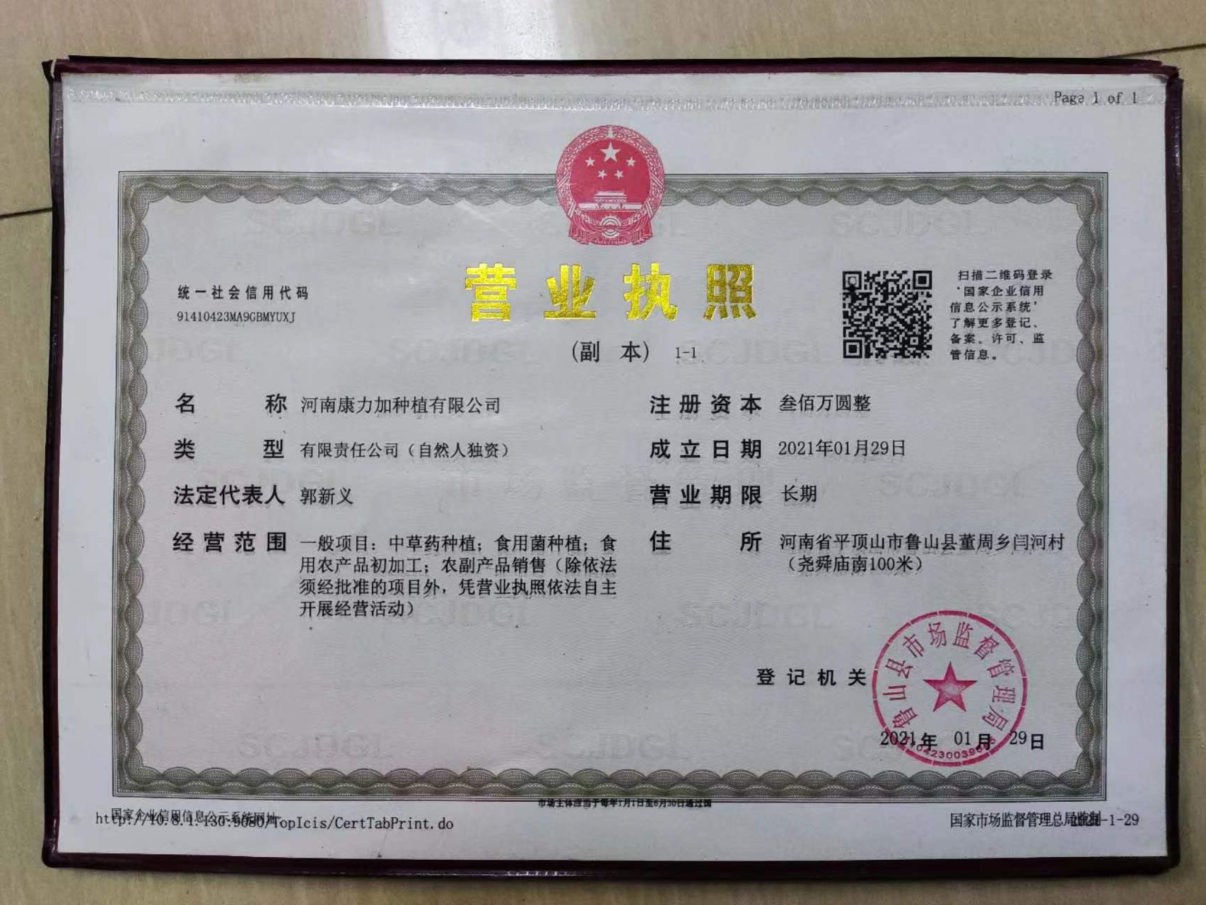 河南省康力加種植有限公司創建于2016年,位于河南省平頂山市魯山縣城以西伏牛山之側,八百里伏牛山生長了枝葉繁茂的椴木林,山清水秀,光照充足,溫度適宜,更適合靈芝的生長和集約化培植。康力加靈芝種植基地引進仿野生優良菌種,培育出了優質的靈芝孢子粉;其靈芝孢子粉各項生化指標均達到或超過國家標準,基地規模不斷擴大,保證了靈芝孢子粉的國內外客戶需求。產品不但銷到遼寧、吉林、黑龍江、新疆、安徽等,還遠銷香港、新加坡等海外市場。